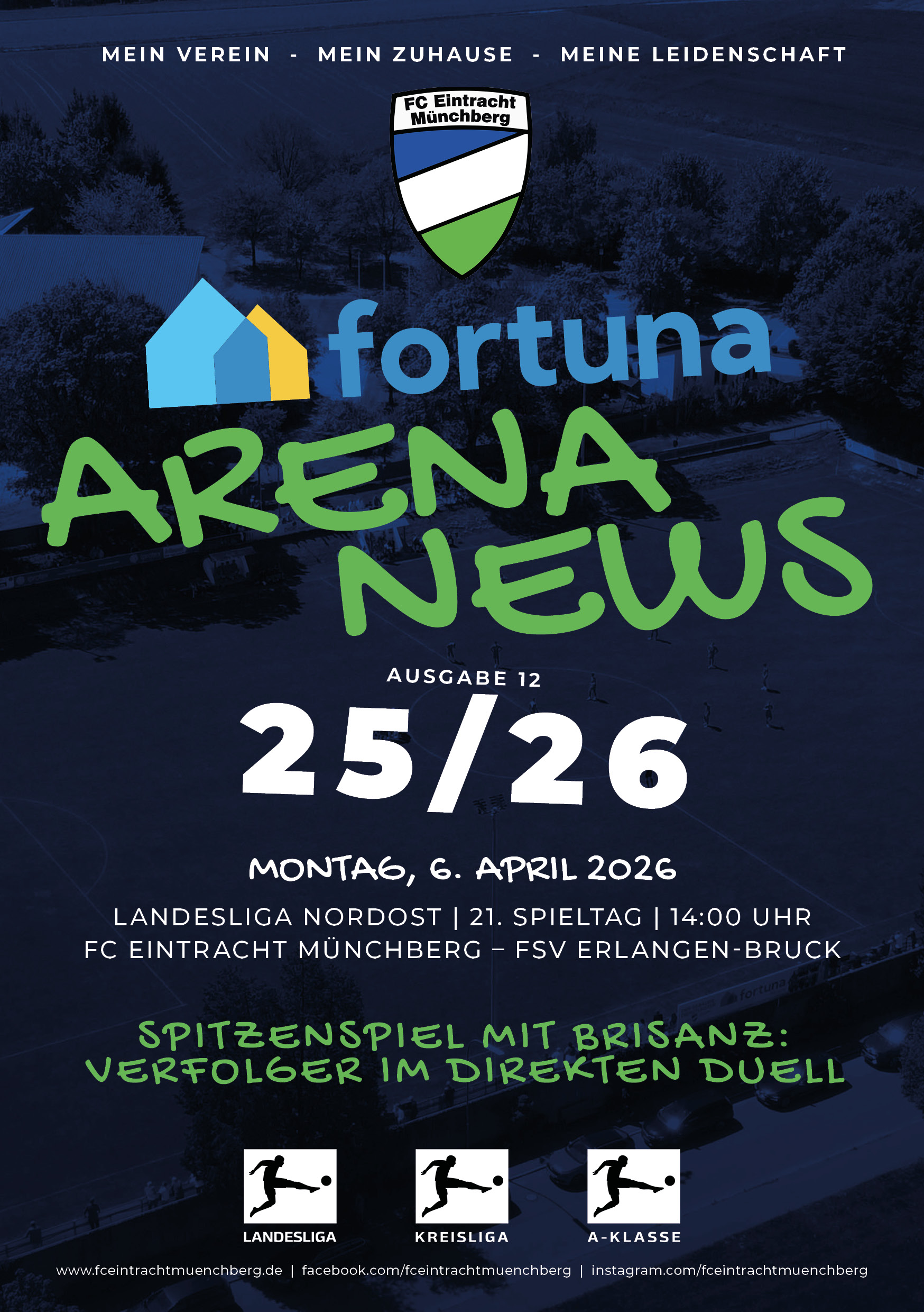 Liebe Sportfreundinnen und Sportfreunde, zum nächsten Heimspiel in der Landesligasaison 2025/26 begrüßt Sie der FC Eintracht Münchberg zum Spiel gegen den FSV Erlangen-Bruck recht herzlich in der FORTUNA-ARENA, unserer vereinseigenen FCE-Platzanlage unterm Rohrbühl. Unser besonderer Gruß gilt natürlich der Gastmannschaft aus Mittelfranken mit ihren Anhängern, mit denen wir gemeinsam auf ein faires und interessantes Spiel hoffen.